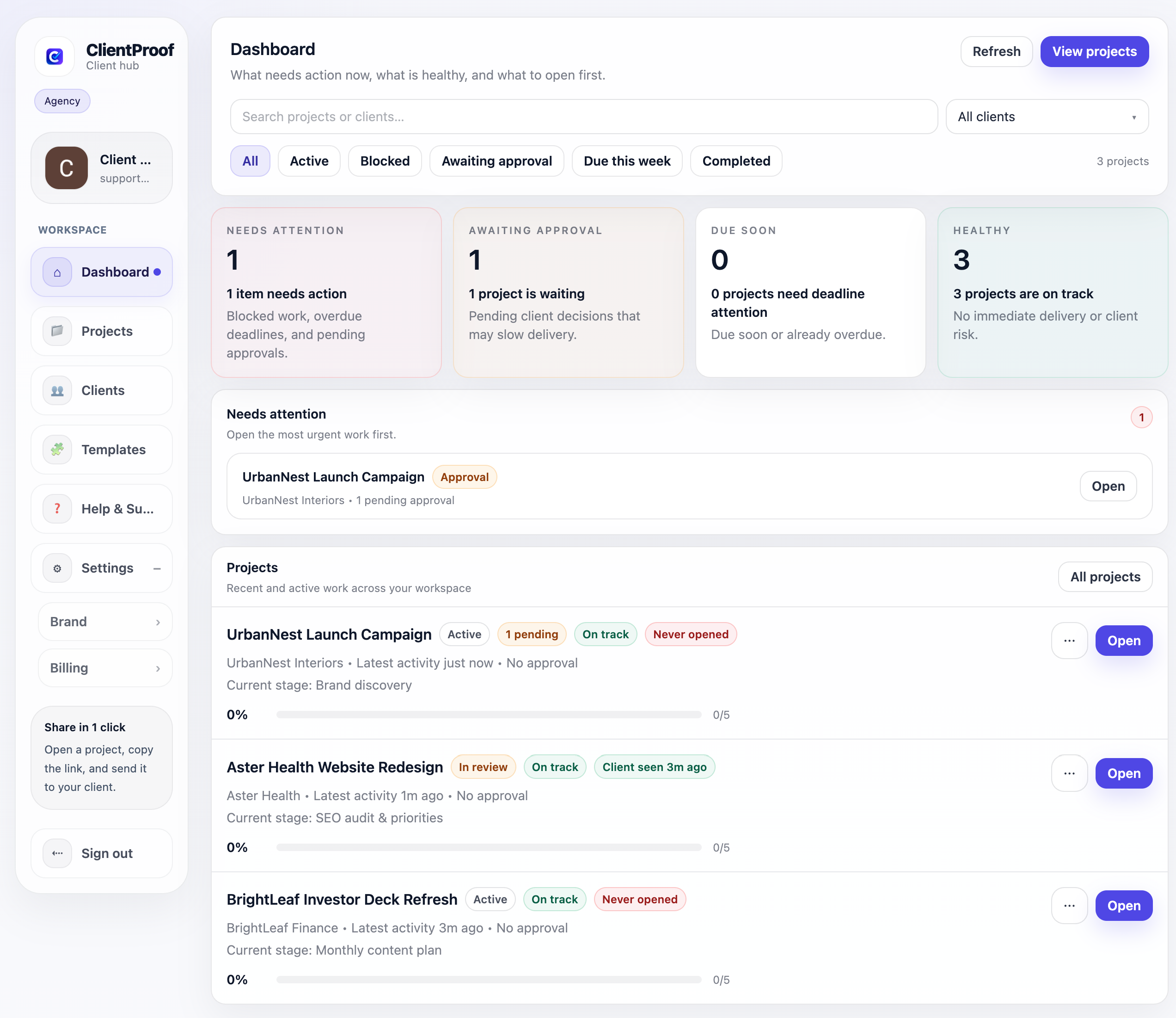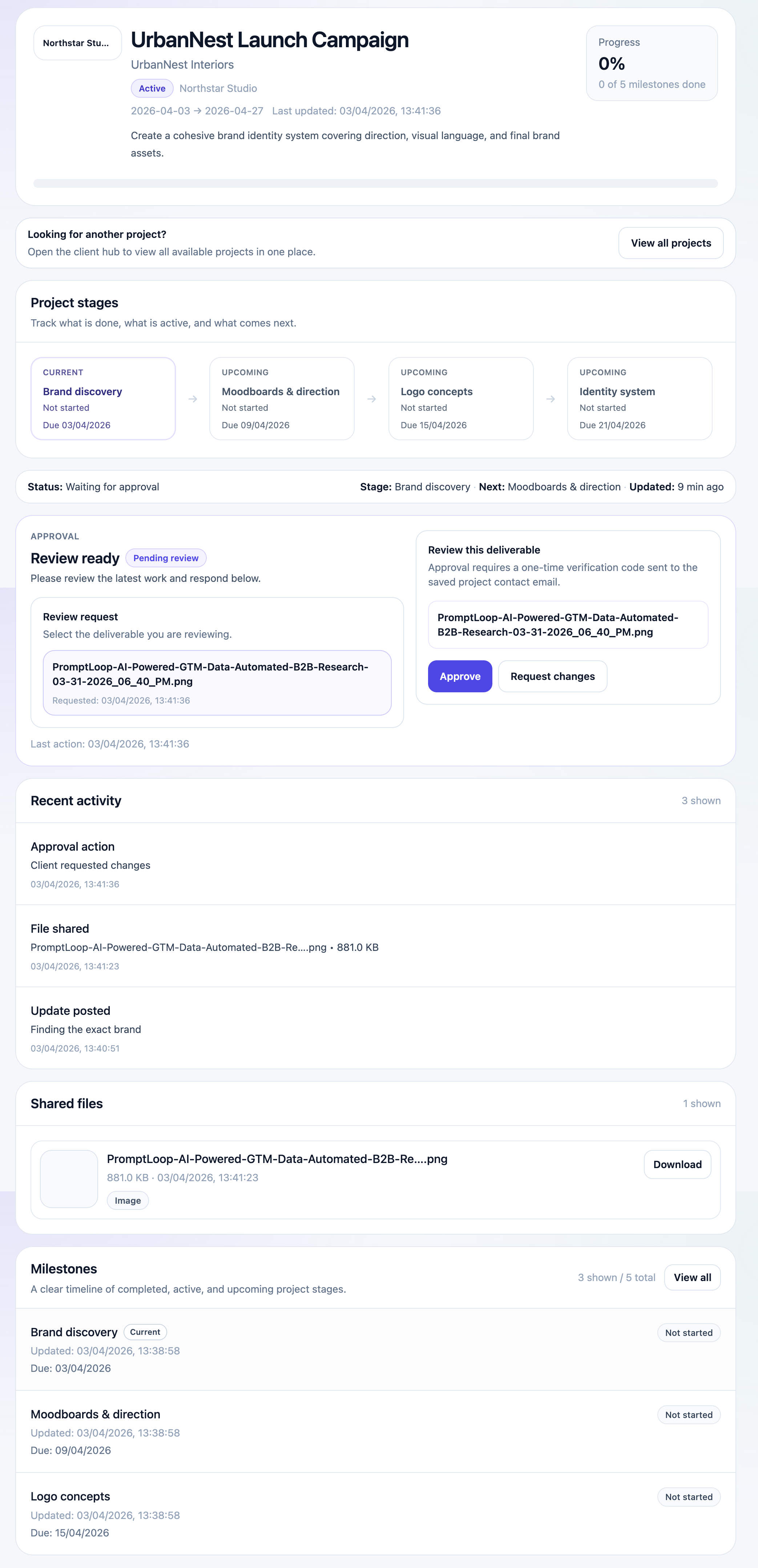 Motion.io focuses on onboarding workflows. ClientProof is designed as a client portal for delivery visibility with updates, approvals, milestones, and files in one page.